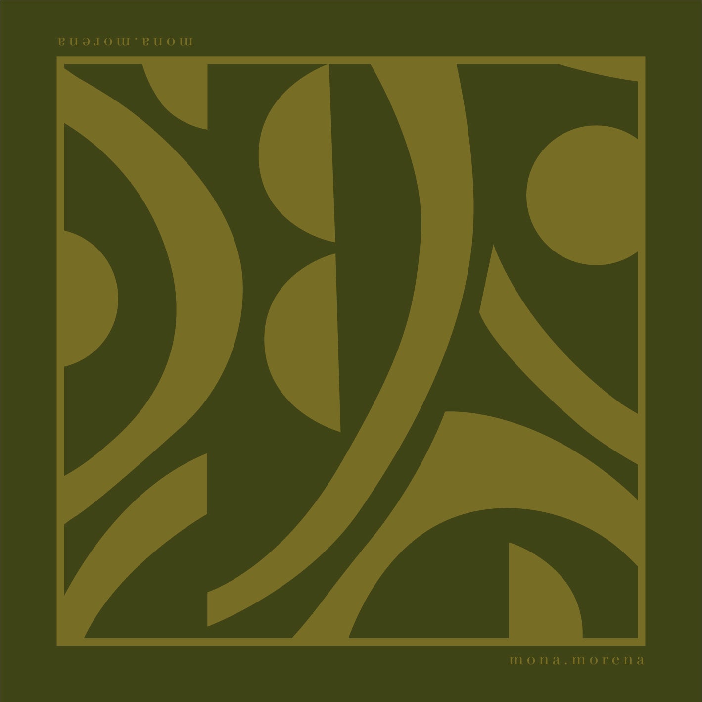 Pañoleta en seda, estampada con ilustración original geométrica en tonos verdes.
