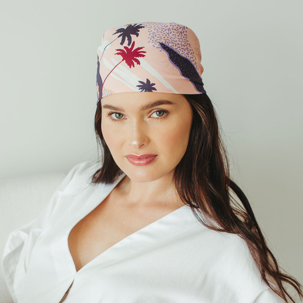 Pañoleta en seda, estampada con ilustración original de varios colores como el magenta, varias tonalidades de azul, el terracota y un fondo palo de rosa. Este diseño está inspirado en el Valle del Cocora, un paisaje mágico que se encuentra en el Eje Cafetero de nuestro país, Colombia. Este paisaje es mundialmente reconocido por el gran número de palmas de cera que se caracterizan por su altitud.